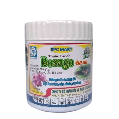 Bosago 12AB là thuốc dạng bã mồi, dùng trừ ốc nhớt, ốc sên, ốc bưu hại hoa kiểng, phong lan trồng trong chậu, vườn ươm hay vườn trồng.